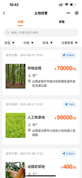 - 在平台认证土地管理员的用户,在完善地块信息后,可以发布土地出租信息。平台所有用户均可发布土地求租信息。