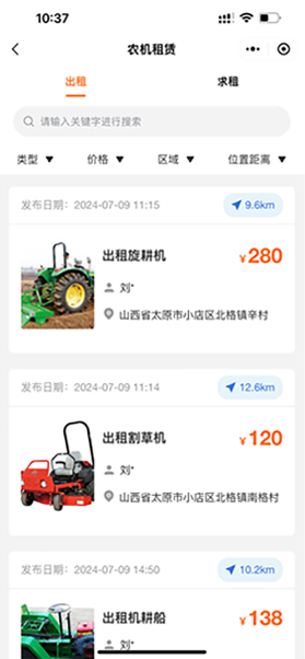 - 用户可以在平台发布农机租用和农机出租信息,以便将闲置农机出租给其他农业生产者使用,提高农机使用率。