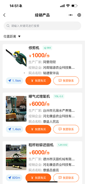 - 在平台认证经销企业的用户,可以发布经销网点和产品信息。方便平台用户查看相关网点信息以及购买农机产品。