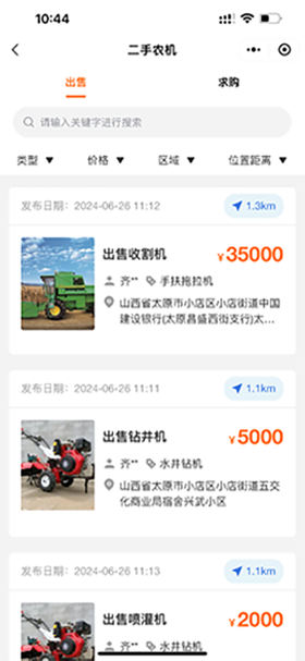 - 用户在平台可以发布二手农机出售和求购信息,以便将农机出售给其他用户。