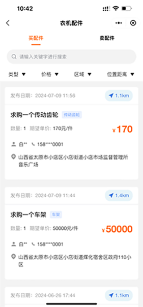 - 用户可以在平台发布买农机配件和卖农机配件信息,方便机主便捷地买到需要的配件。配件供应商可以发布卖配件信息,普通用户可以发布买配件信息。