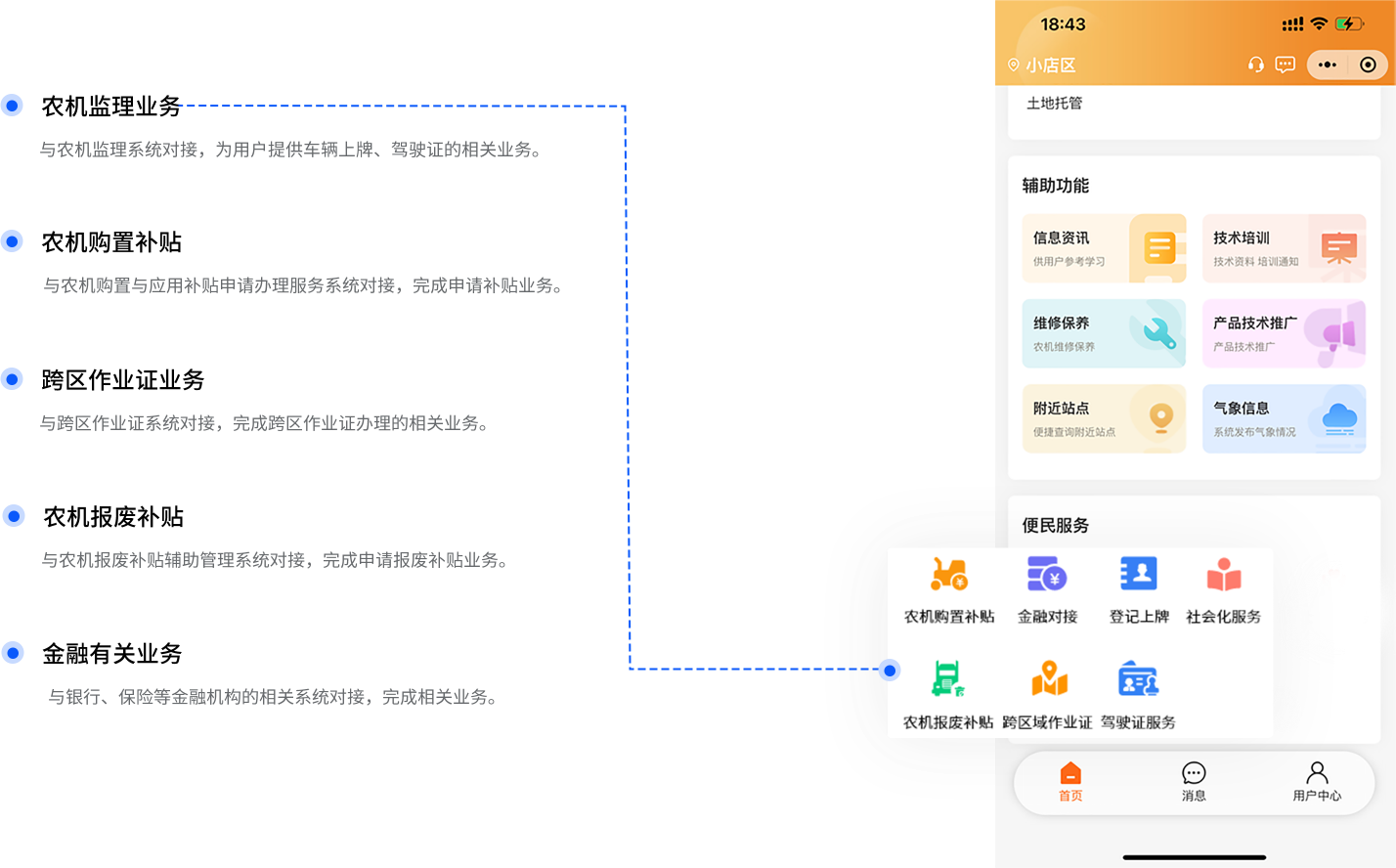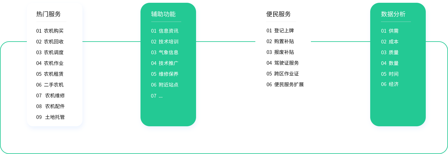 平台开发和集成了农机购置前的选机、金融服务;购置后的登记上牌服务;上牌后的申领补贴服务;作业中的社会化服务、维修服务;后期的报废和申领补贴服务;实现农机资源整合。为群众提供便利增加收入,为企业拓宽业务渠道,为管理部门提供监管和决策数据支持。