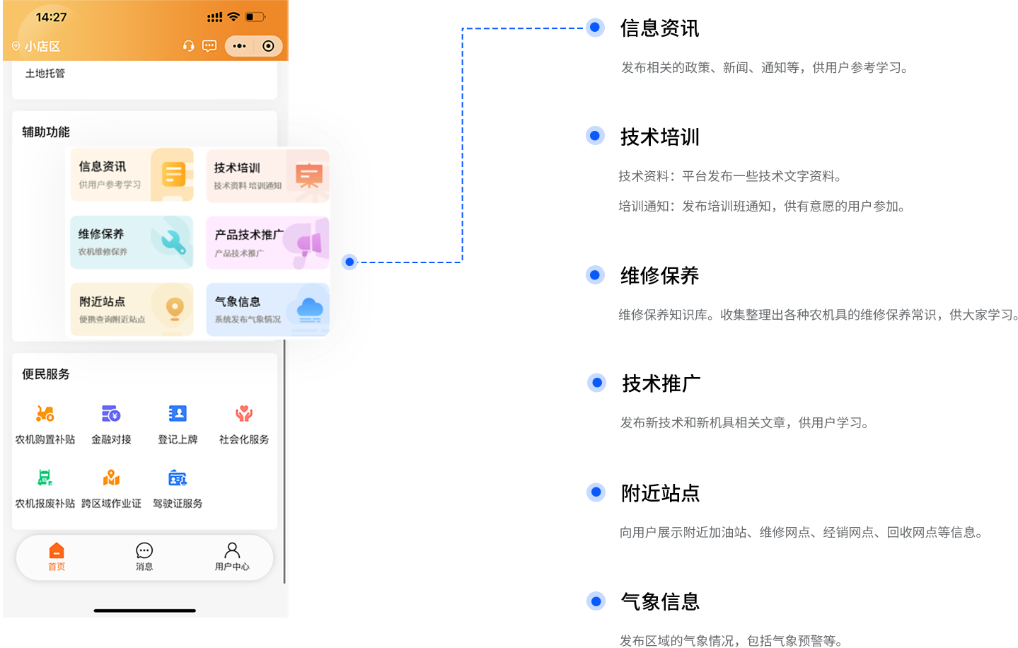 移动端是平台的核心,主要完成各项社会化服务的供需方合作业务,以及落实完成农机调度的各项任务,移动端分为三部分,分别是:热门服务、辅助功能、便民服务。
