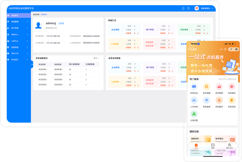 计算机端主要用于对平台的管理、审核和监控。包括:管理部门的数据监控、农机调度,管理员的平台管理、信息审核、数据分析等。