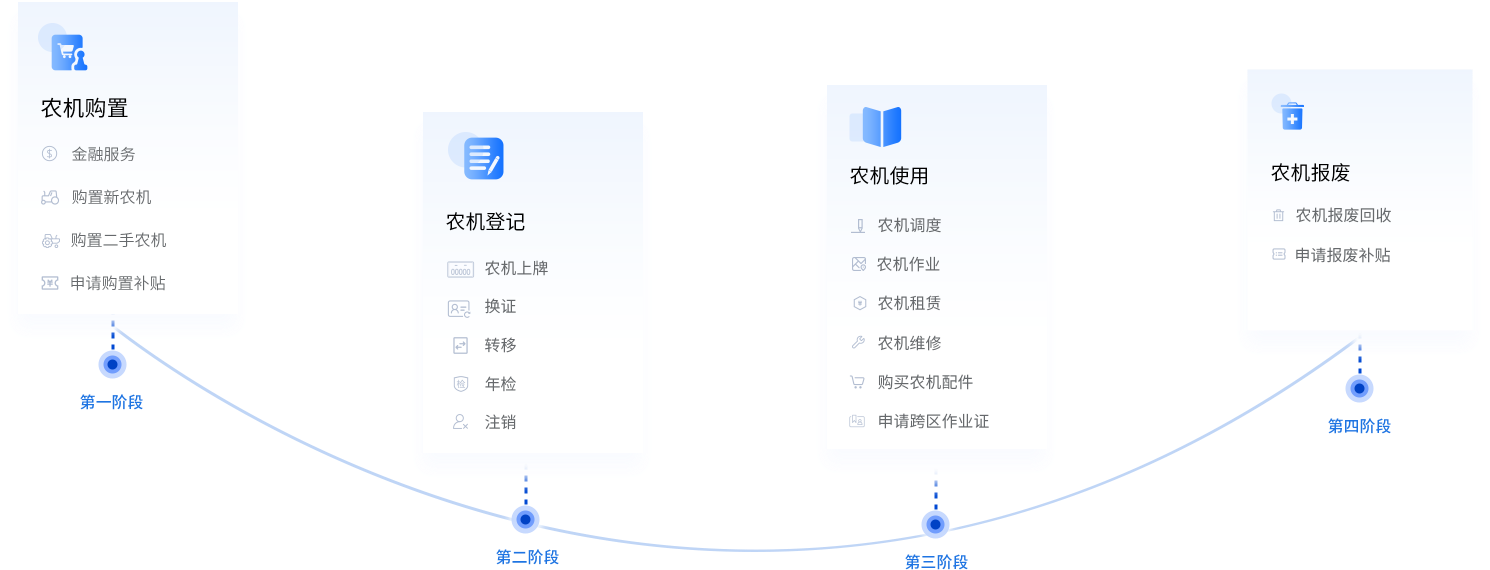 为更好的满足企业、群众关于农业机械有关的办事需求,针对农机服务分散、脱节、周期长等问题,梳理形成“一站式”农机服务,立足企业和群众角度,围绕农机的购置、登记、使用、报废等环节,为企业和群众提供农业机械全生命周期的服务。